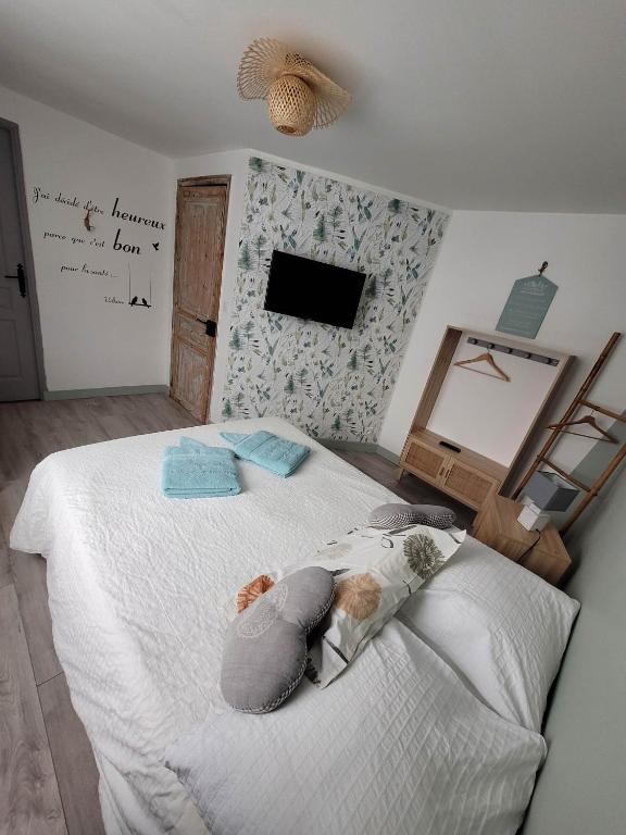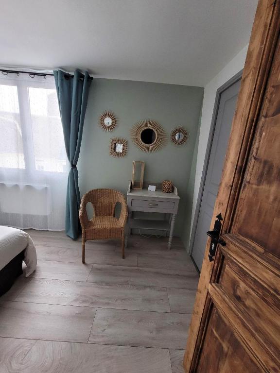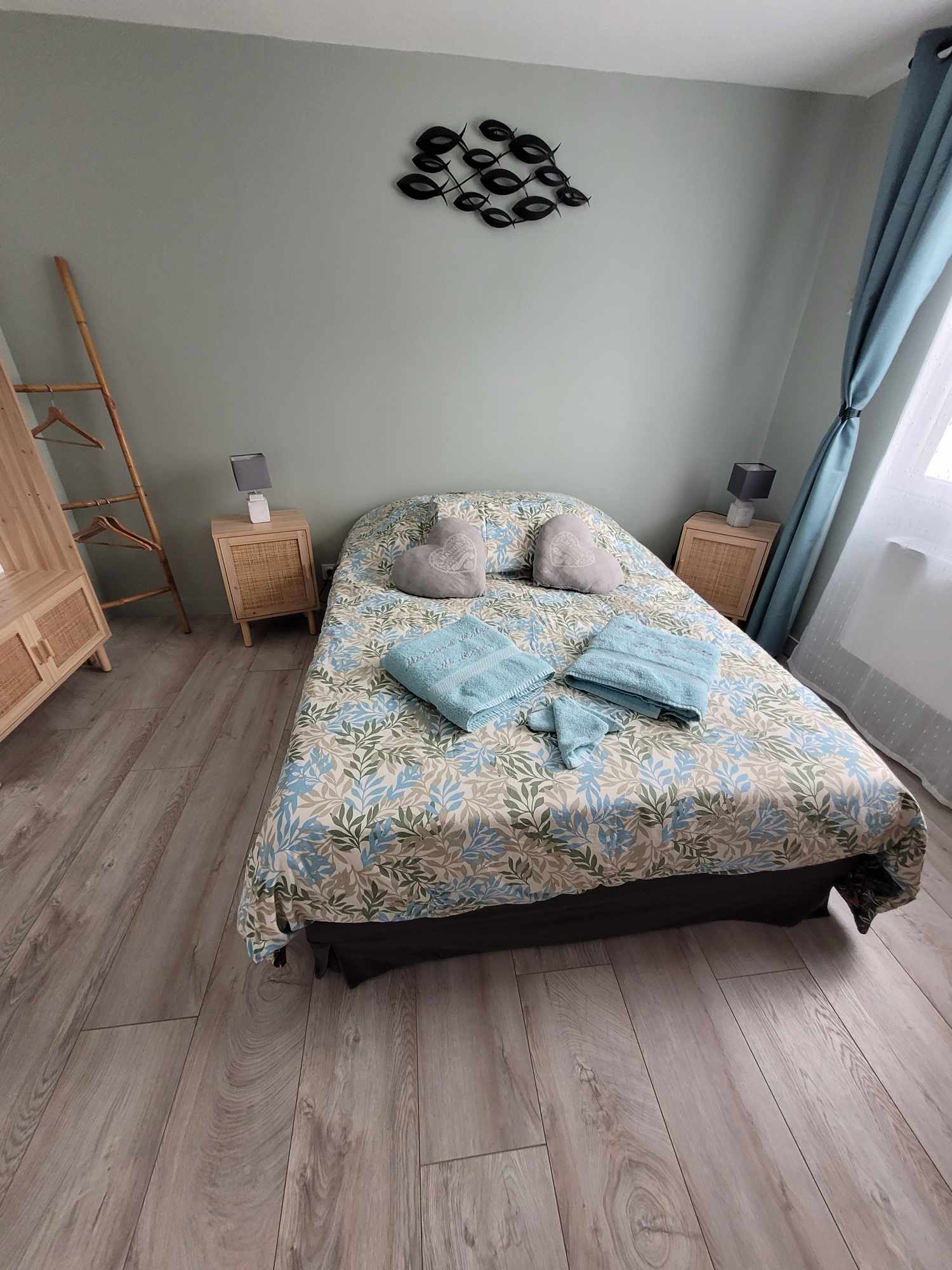 Cette chambre, nichée au premier étage de la maison d’hôtes At’home, à une enjambée de la plage, offre une escapade sereine avec son ambiance ‘Bobo Hygge’.