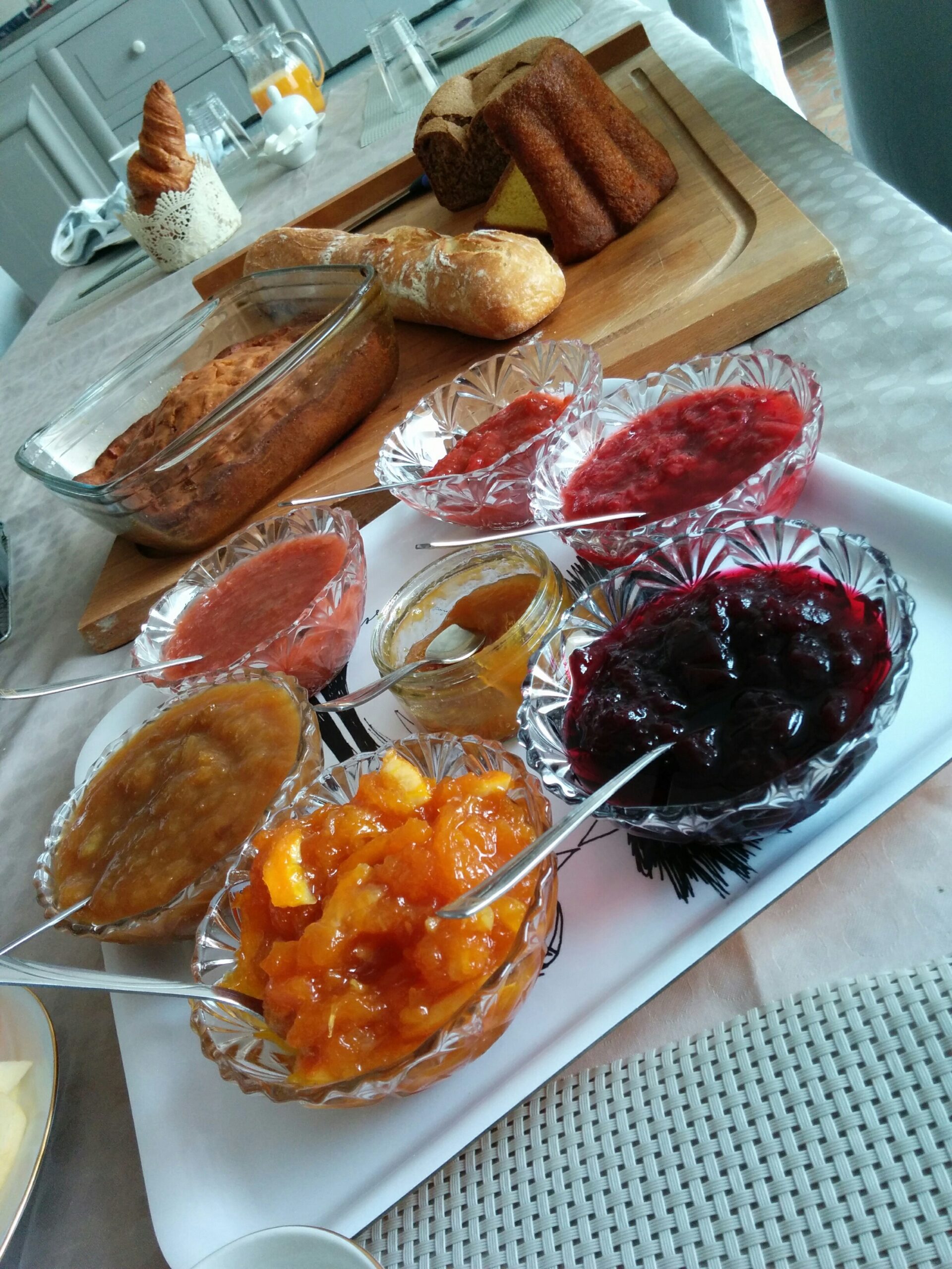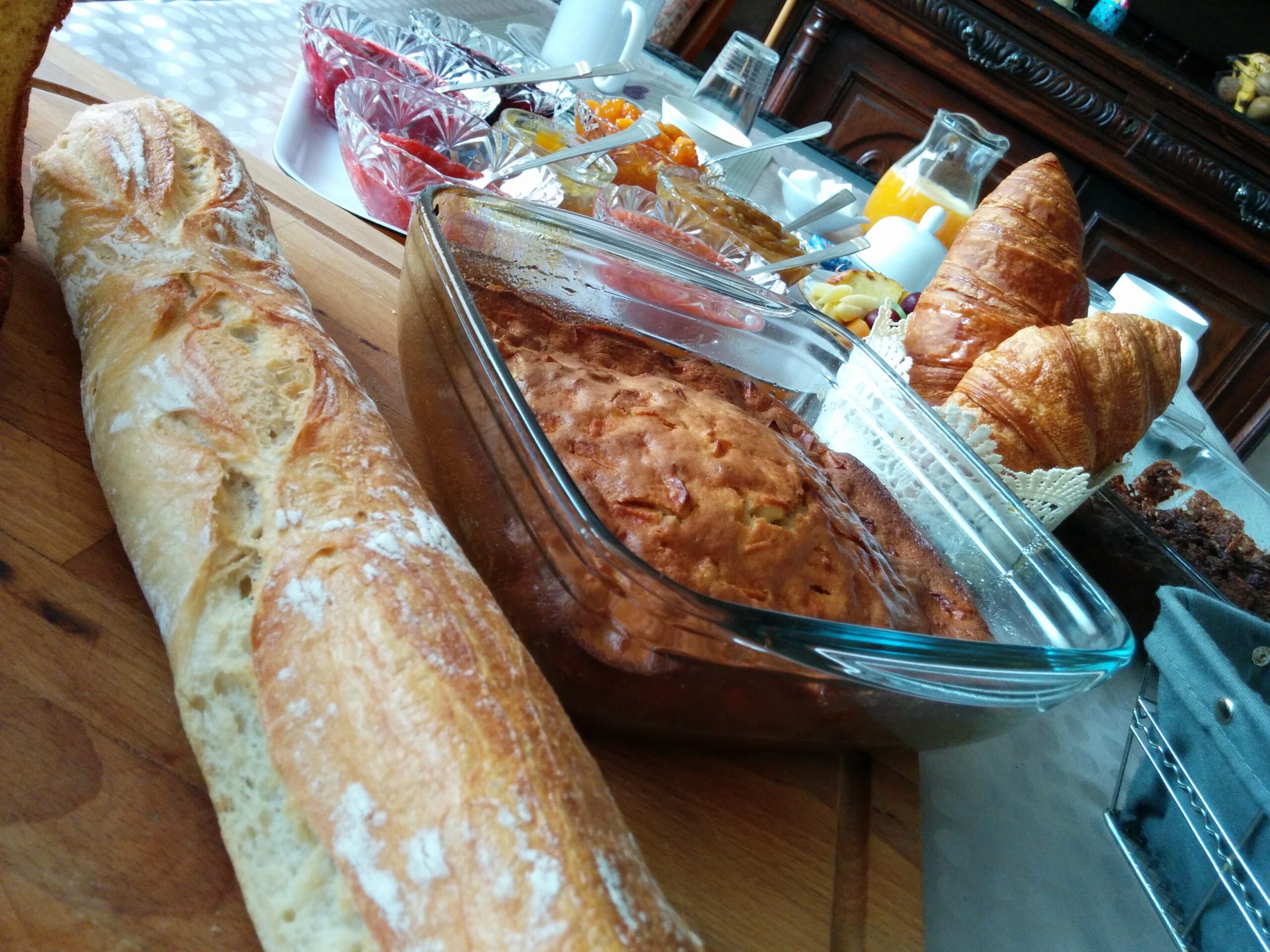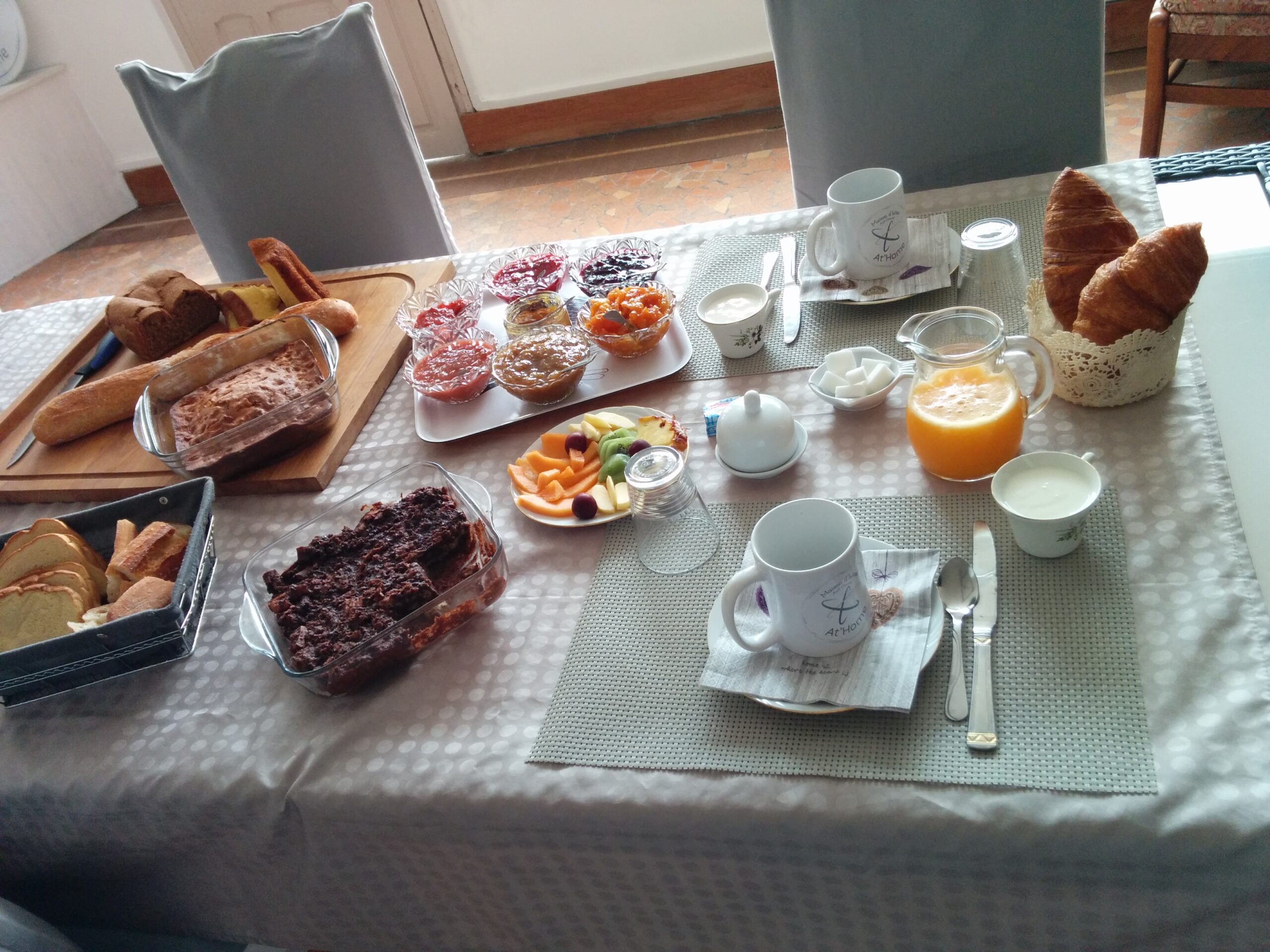 - Les petits déjeuners sont servis de 8h à 10h, pains viennoiseries mais aussi gâteau, confitures et yaourts maison ainsi que jus d'orange frais vous seront servis.